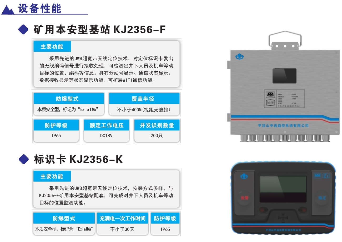 產(chǎn)品簡(jiǎn)介:KJ2356J煤礦井下人員精確定位系統(tǒng),采用超寬帶無(wú)線(UWB)、慣性測(cè)量單元(IMU)、到達(dá)時(shí)差法(TODA)等多源融合定位方法,實(shí)現(xiàn)井下移動(dòng)目標(biāo)定位精度小于0.3米的井下類GPS系統(tǒng)。該系統(tǒng)不僅強(qiáng)化了人員位置的精準(zhǔn)感知,實(shí)現(xiàn)煤礦井下作業(yè)人員位置的監(jiān)測(cè)管理、報(bào)警、各類數(shù)據(jù)查詢及報(bào)表功能。同時(shí)支持與車輛定位融合,將精準(zhǔn)定位技術(shù)應(yīng)用到井下機(jī)車、采掘裝備等各類設(shè)備。該系統(tǒng)具有定位精度高、抗干擾能力強(qiáng),系統(tǒng)容量大、安裝使用簡(jiǎn)便等特點(diǎn),對(duì)煤礦高效生產(chǎn)和應(yīng)急教援具有十分重要的意義。該系統(tǒng)不僅強(qiáng)化了人員位置的精準(zhǔn)感知,實(shí)現(xiàn)煤礦并下作業(yè)人員位置的監(jiān)測(cè)管理、報(bào)警、各類數(shù)據(jù)查詢及報(bào)表功能。同時(shí)支持與車輛定位融合,將精準(zhǔn)定位技術(shù)應(yīng)用到井下機(jī)車、采掘裝備等各類設(shè)備。