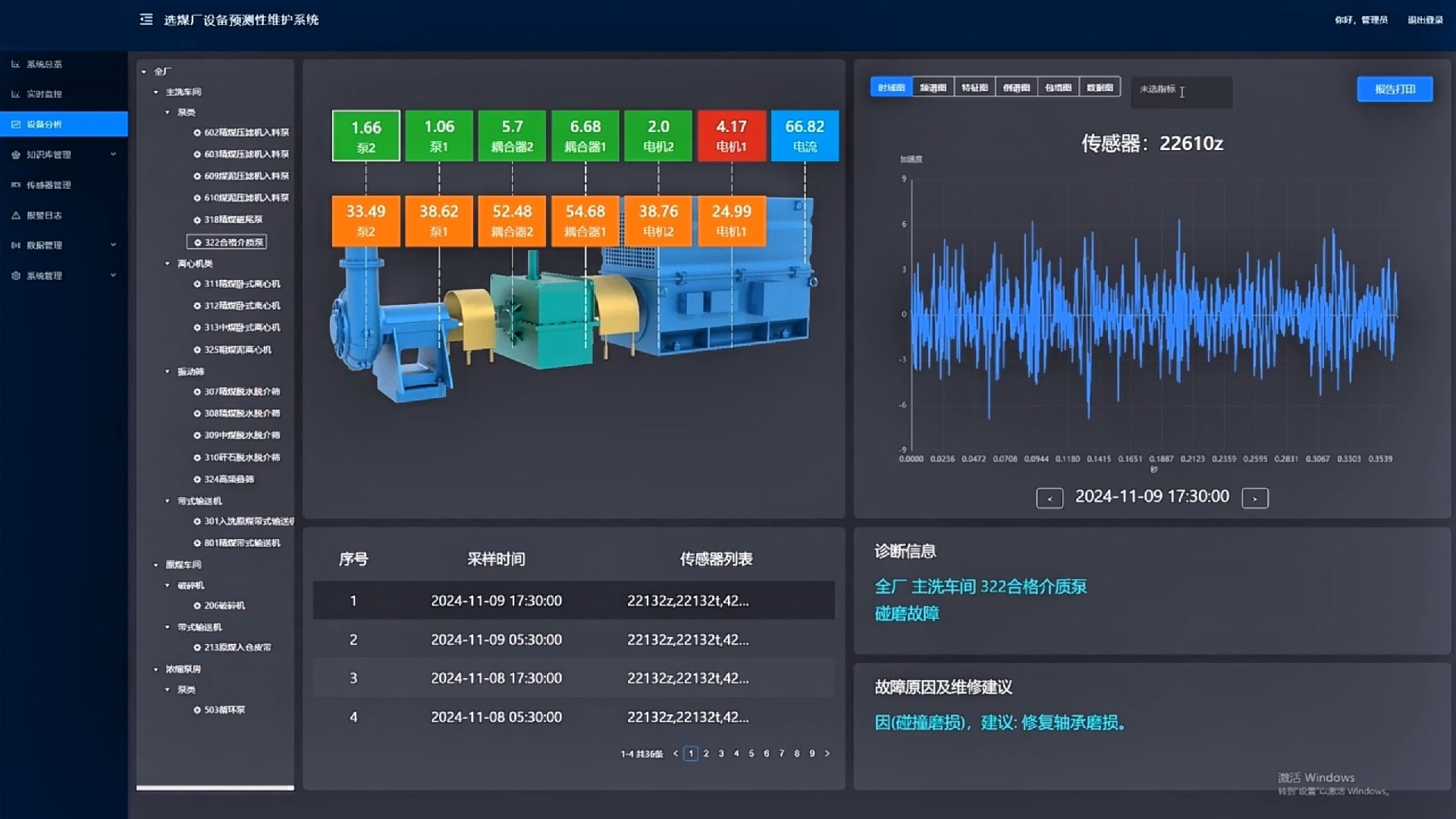 產(chǎn)品簡介:選煤廠設(shè)備預(yù)測性維護(hù)系統(tǒng)實(shí)時(shí)采集選煤廠生產(chǎn)設(shè)備的多維數(shù)據(jù)(溫振數(shù)據(jù)、電氣數(shù)據(jù)、設(shè)備實(shí)時(shí)數(shù)據(jù)、設(shè)備管理數(shù)據(jù)、音視頻數(shù)據(jù)),利用先進(jìn)數(shù)字信號處理算法、人工智能算法、專家知識庫等方法對設(shè)備進(jìn)行實(shí)時(shí)監(jiān)測、故障分析和故障溯源。在設(shè)備出現(xiàn)異常時(shí),能夠分析出異常原因,給出合理維修建議,生成維修報(bào)告并白動(dòng)推送給檢修人員,指導(dǎo)檢修人員進(jìn)行設(shè)備維護(hù),實(shí)現(xiàn)流程化閉環(huán)管理。選煤廠設(shè)備預(yù)測性維護(hù)系統(tǒng)可早期發(fā)現(xiàn)設(shè)備異常,實(shí)現(xiàn)由“事后維修”向“預(yù)知檢修”的轉(zhuǎn)變,從而實(shí)現(xiàn)設(shè)備維護(hù)安全損失最小、總維護(hù)成本最低、總維修時(shí)間最少。